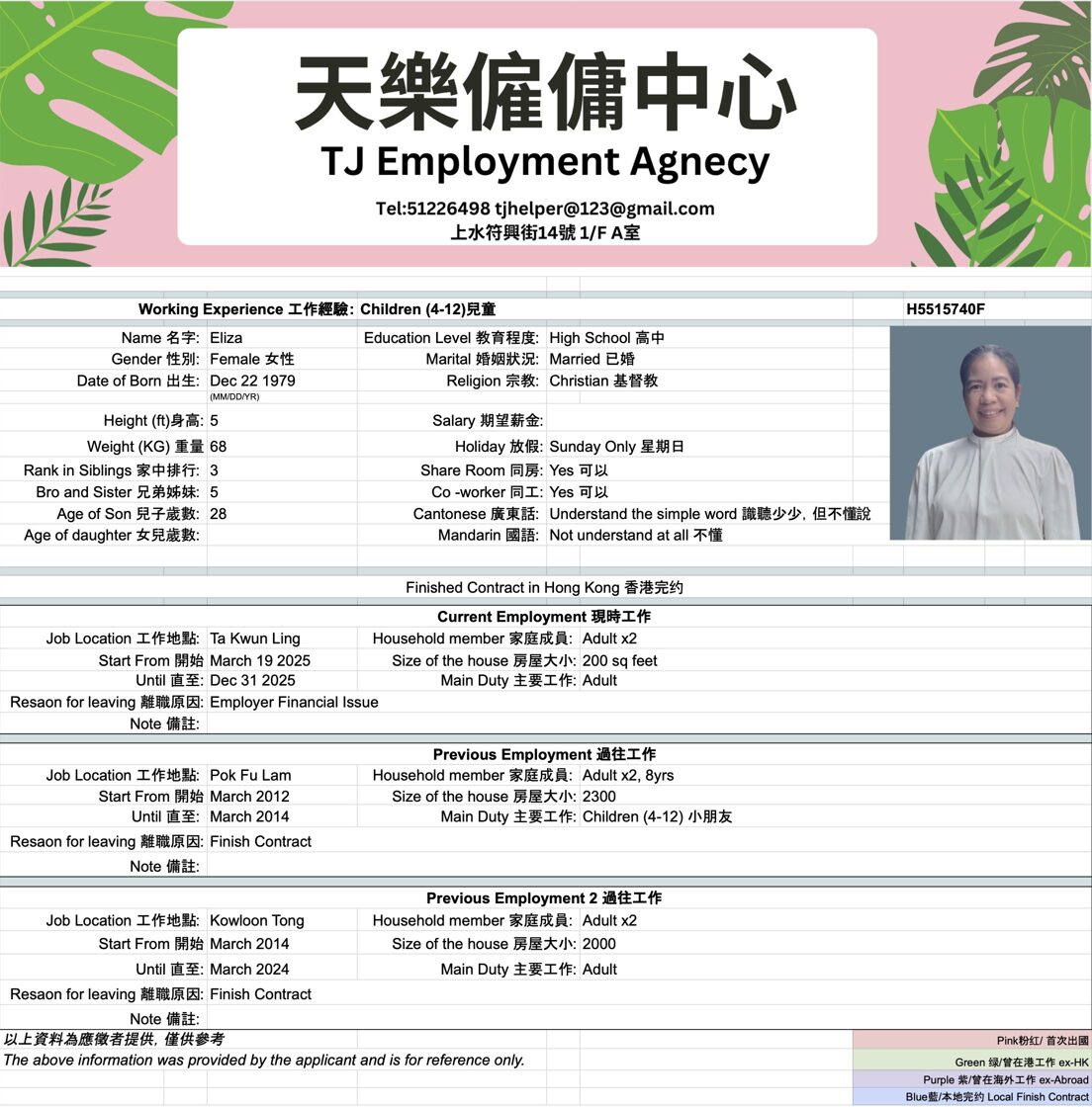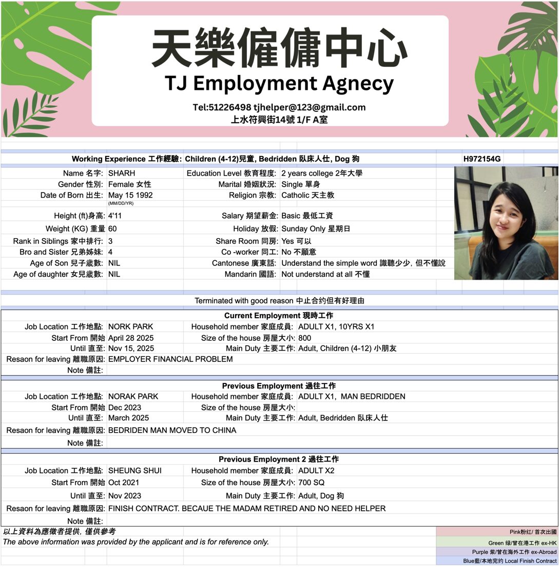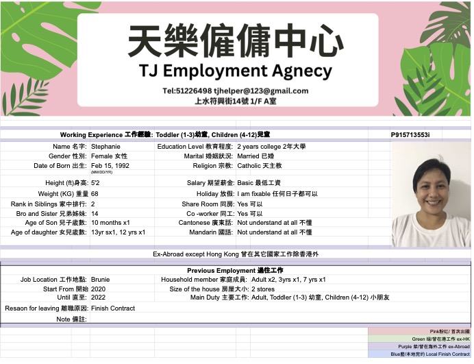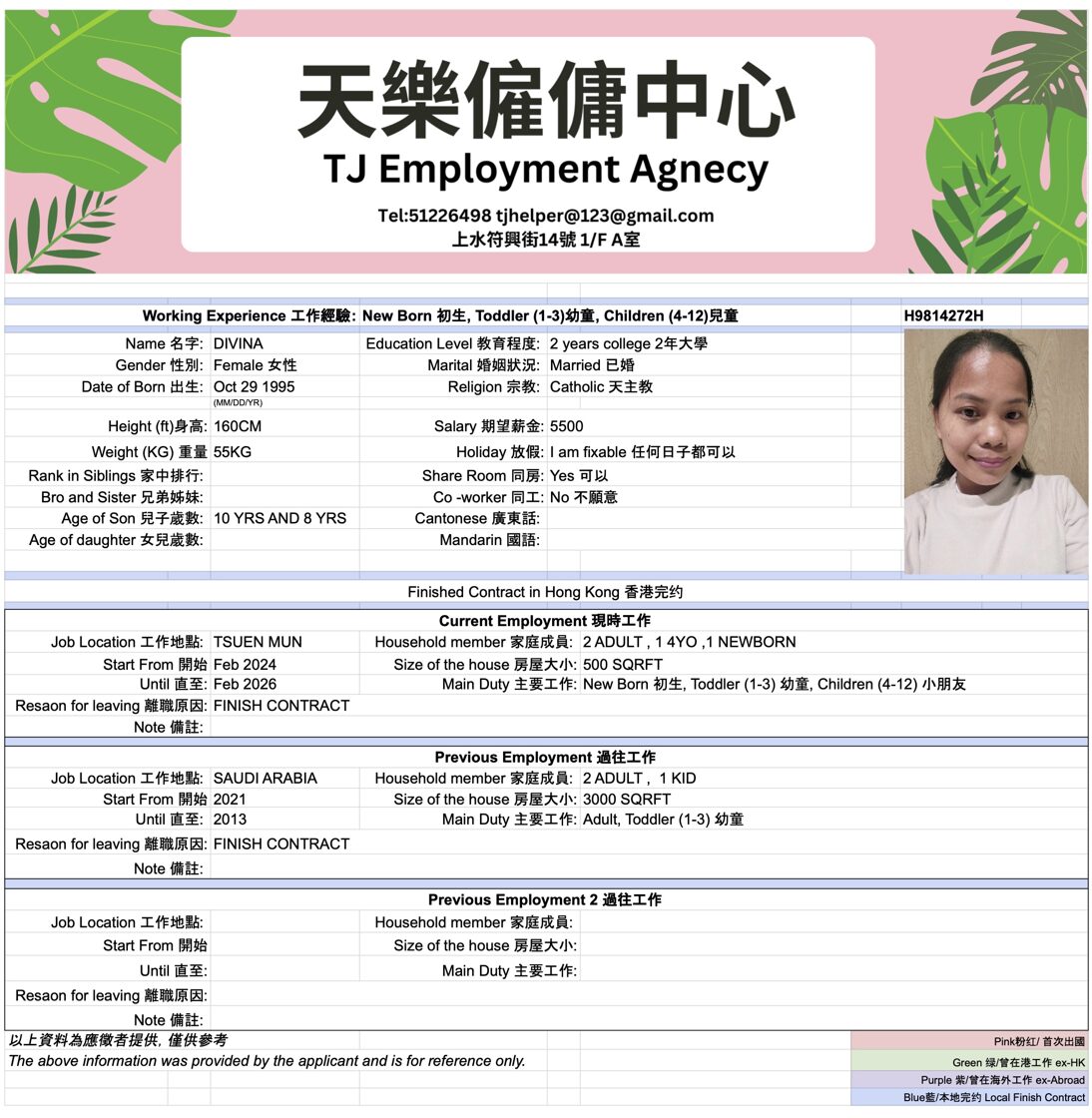 H9154992F /9月30日完约/8年同一位僱主/有照僱小朋友經驗